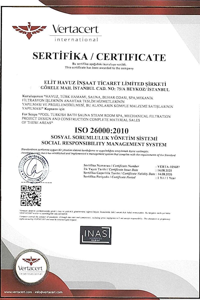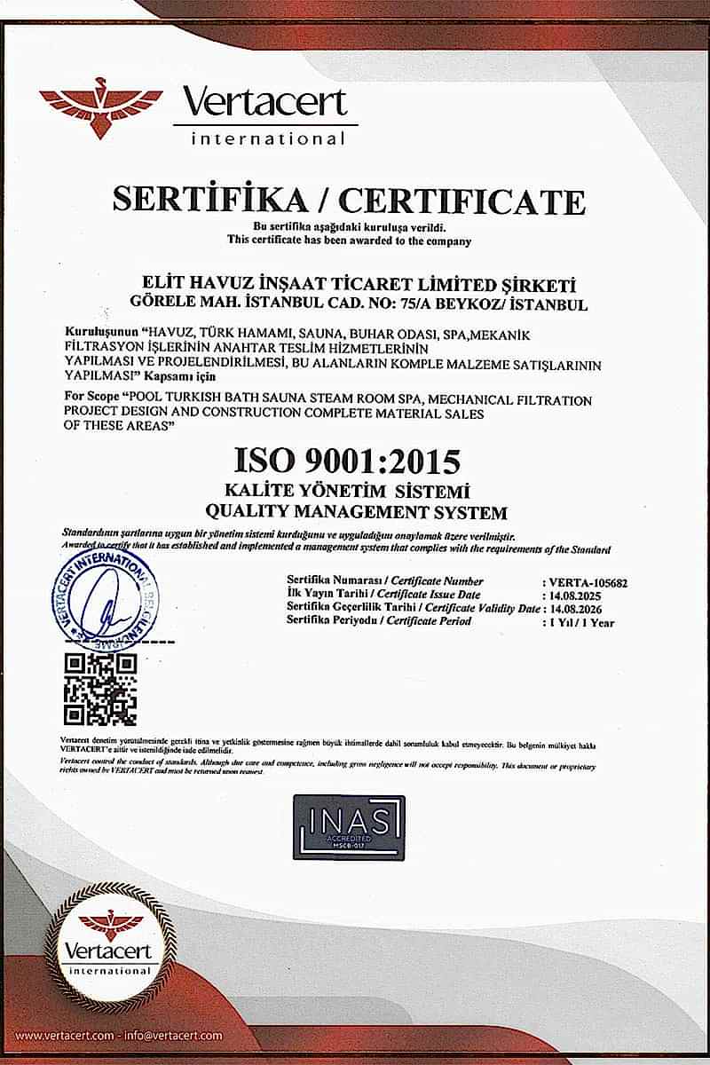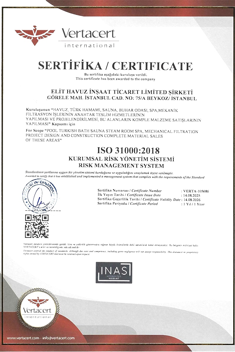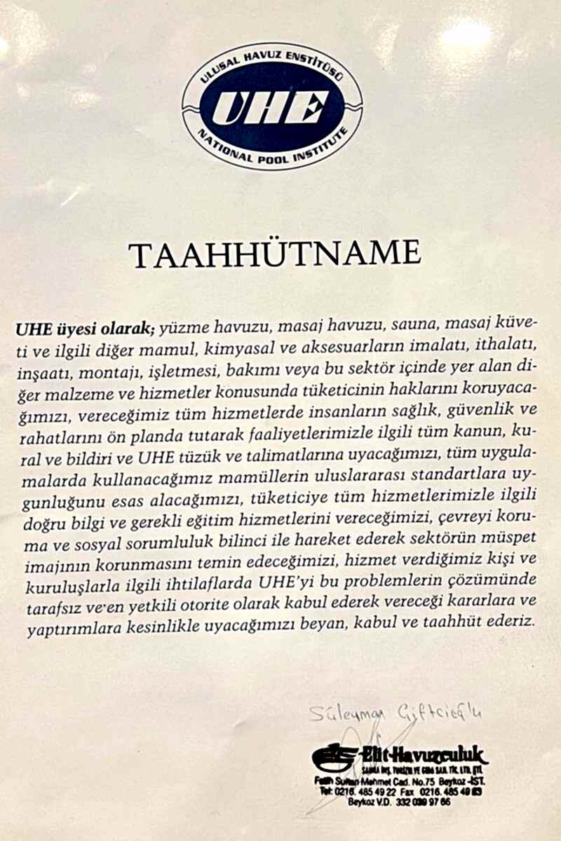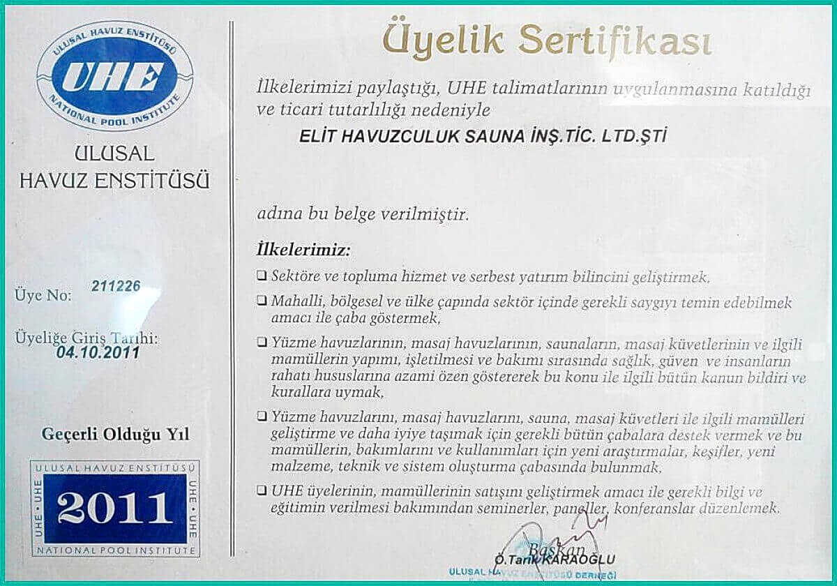 Elit havuz olarak Ulusal Havuz Enstitüsü üyesiyiz. Faaliyet alanlarımız ile ilgili tüm kalite ve profesyonel sertifikalarımız vardır.
